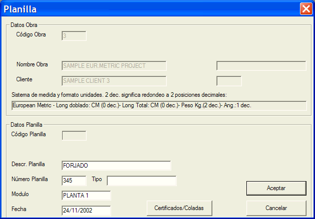El campo opcional Módulo sirve para agrupar las planillas en entidades de las que después será interesante saber el total de kilos y las planillas que los componen. Por ejemplo si una obra es un edificio de 5 plantas, podemos teclear en todas las planillas de la planta 1 el módulo PLANTA 1 , en todas las planillas de la planta 2 pondremos PLANTA 2 , y así sucesivamente, poniendo cuidado de escribirlo igual en todas las planillas del mismo módulo (sin cambiar espacios, acentos, mayúsculas minúsculas, etc). Así después podremos obtener el total de kilos y listar todas las planillas de cada planta. Esto lo podremos hacer con la opción Planillas->Listado de Planillas.