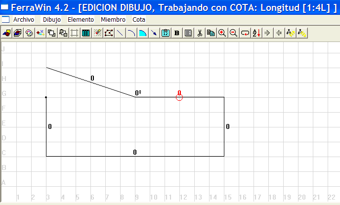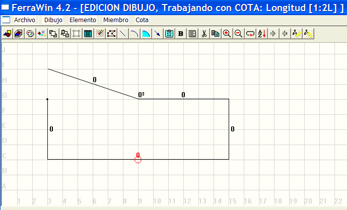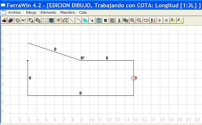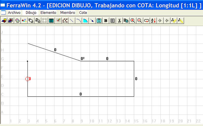 Haga click con el botón izquierdo del ratón sobre 3-E para seleccionar y poner de rojo la cota que representa la medida del primer tramo. En el título de la ventana verá: MODO DIBUJO, Trabajando con COTA: Longitud [1:1L]