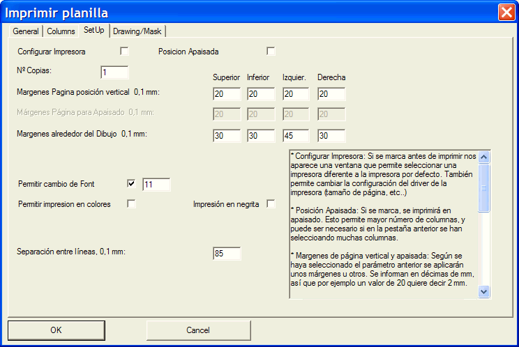 Tanto si se ha configurado el color a nivel general como particular, para que tenga efecto debe también tenerlo en cuenta a la hora de imprimir, en la ventana de impresión de planillas, en la pestaña Setup, marcando la casilla Permitir impresión en colores.