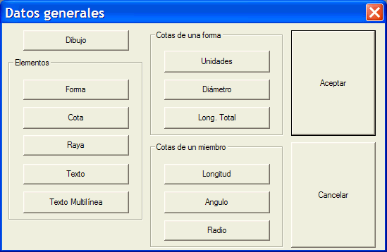 El botón Cota es para los elementos de tipo Cota Auxiliar, el botón Raya para los de tipo Línea Auxiliar y el de Texto para los elementos tipo texto. Verá que que en el caso de la cota auxiliar y de la línea auxiliar el Tam. Planilla y el Tam. Etiqueta están en blanco, quiere decir que cuando se imprimen lo hacen con el grosor de trazo mínimo.